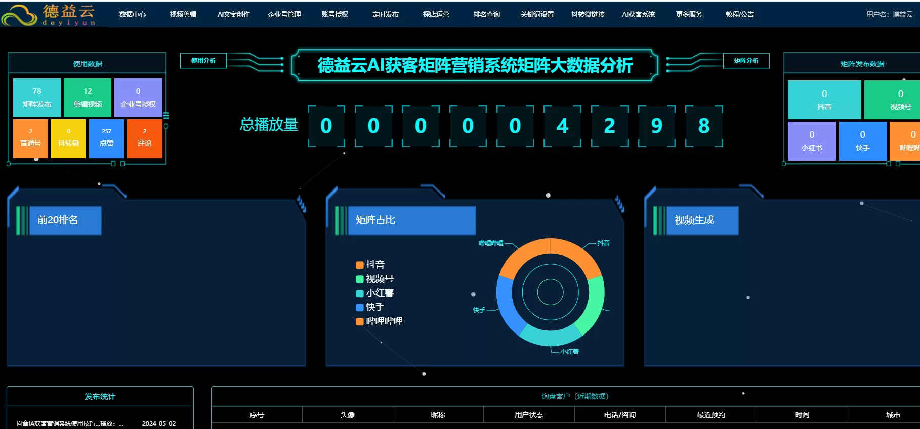 短视频矩阵账号运营工具的功能有哪些?随着短视频平台的迅速崛起,越来越多的企业开始将短视频作为重要的营销手段。然而,如何在海量的内容中脱颖而出,实现高效的账号运营和获客,成为了摆在众多企业面前的难题。为此,德益云推出了短视频矩阵账号运营工具——一款基于SaaS模式的智能混剪系统,旨在帮助企业轻松打造短视频矩阵,实现精准营......